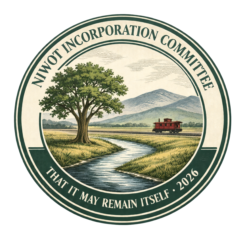 The Niwot Incorporation Committee is a resident-led effort working toward municipal incorporation for Niwot, Colorado. We believe Niwot needs a local government with the authority to address the issues that matter most — starting with downtown vitality, roads, and accountable governance.